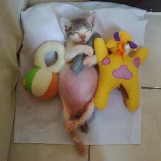 Dok saya mau bertanya saya merescue kucing liar usia 1 bulanan. Sementara itu mata Ochi menguning sementara leher dan kakinya luka-luka. Perut Kucing Mulai Membesar.
